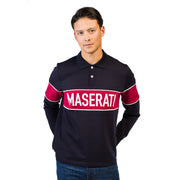 Classic, timeless, sporty. Blue men's polo shirt, long sleeve. A garment inspired by the exciting and legendary victories of the Classic Maserati, real icons of speed and style.